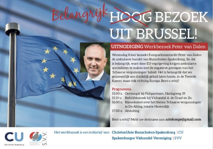vrijdag 03 mei 2019 20:52 Europarlementariër Peter van Dalen (ChristenUnie-SGP) brengt op woensdag 8 mei een werkbezoek aan Bunschoten-Spakenburg. Zijn bezoek staat mede in het teken van de dreigende ‘schaarse vergunningen’ voor ambulante handelaren zoals visspecialisten en brood- en banketverkopers. Deze wetgeving kan grote gevolgen hebben voor bedrijven en werkgelegenheid.